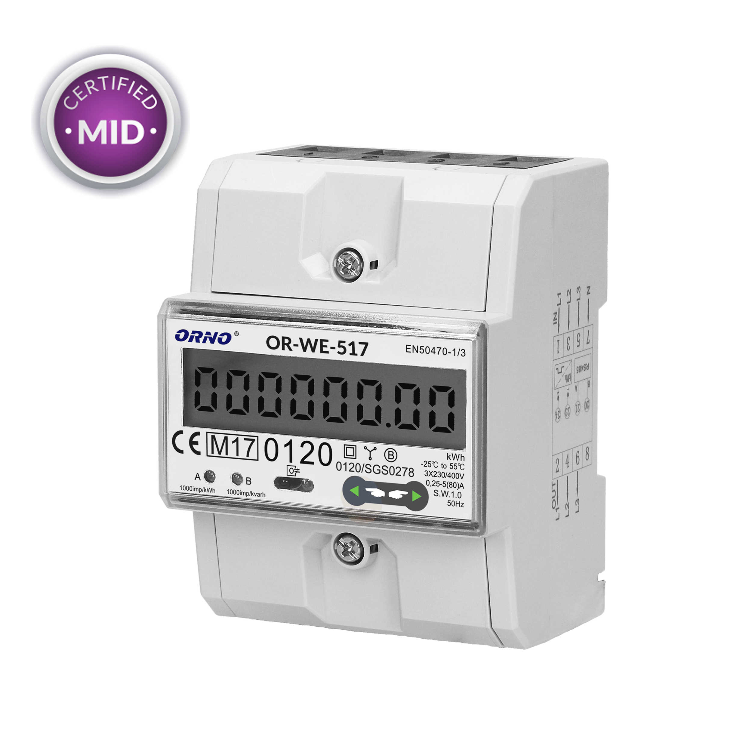 - Elektromer ORNO OR-WE-517, 3 x 230V/400V~, 50/60Hz 80A MID Multitarif