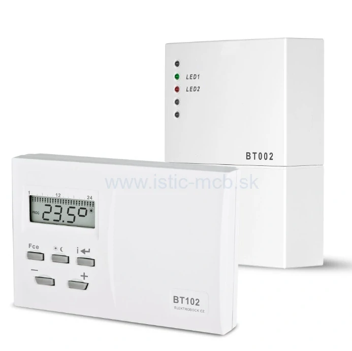 BT102 je jednoduchý bezdrôtový termostat so systémom samoučenia kódov. Slúži pre všetky typy vykurovania v domácnostiach, kanceláriách alebo dielňach.