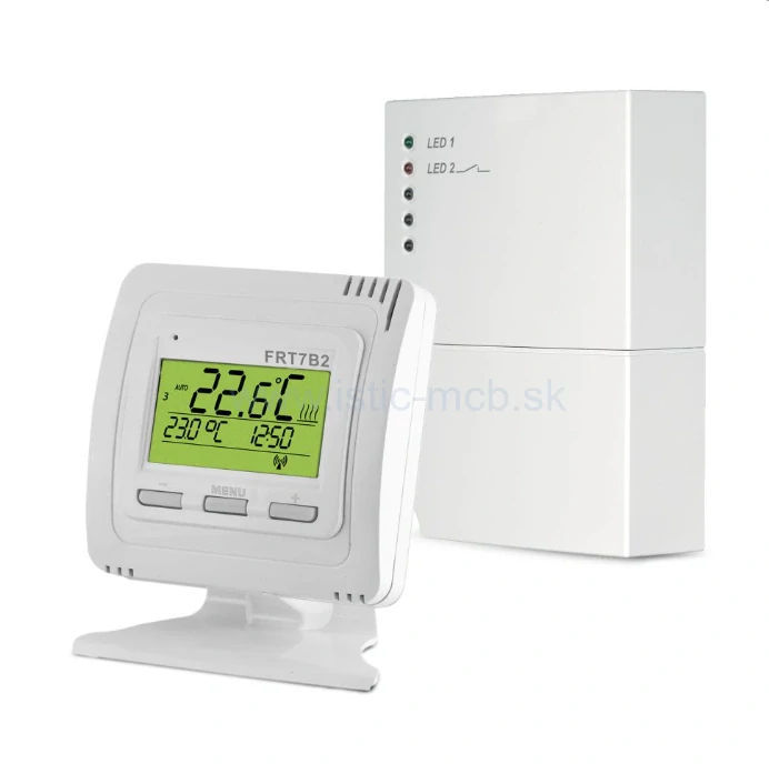 FRT7B2 je set bezdrôtového termostatu - vysielača (monitoruje teplotu v konkrétnej miestnosti) a spínacieho prvku - prijímača (obsluhuje pripojený tepelný zdroj podľa požiadaviek na teplotu).
