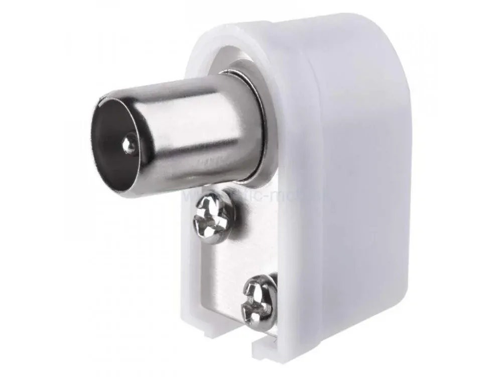 Konektor IEC A205 vidlica zacvakávací uhlový biely. Vidlica je určená na napojenie na koaxiálny kábel.